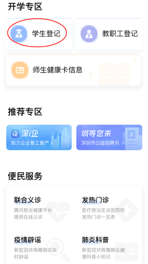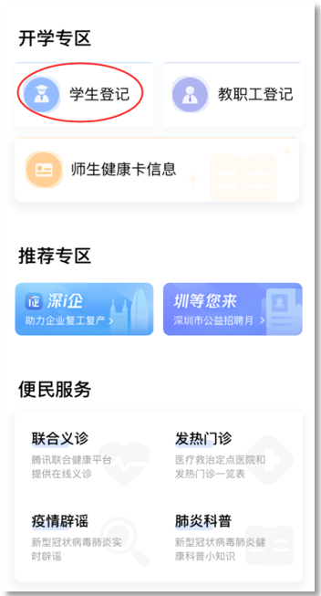 ①在首頁(yè)開(kāi)學(xué)專(zhuān)區(qū),點(diǎn)擊“學(xué)生登記”進(jìn)入申報(bào)人員列表,進(jìn)行自主申報(bào)和實(shí)名認(rèn)證,再進(jìn)行開(kāi)學(xué)登記。