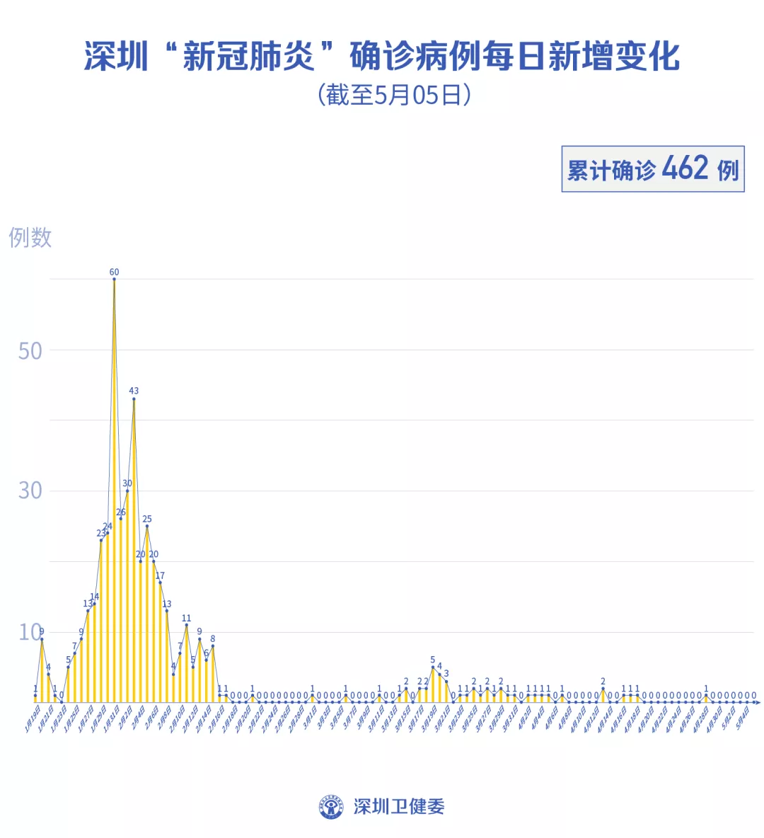 截至5月5日24時(shí),深圳累計(jì)報(bào)告新冠肺炎病例462例。5月5日當(dāng)天新增出院1例。