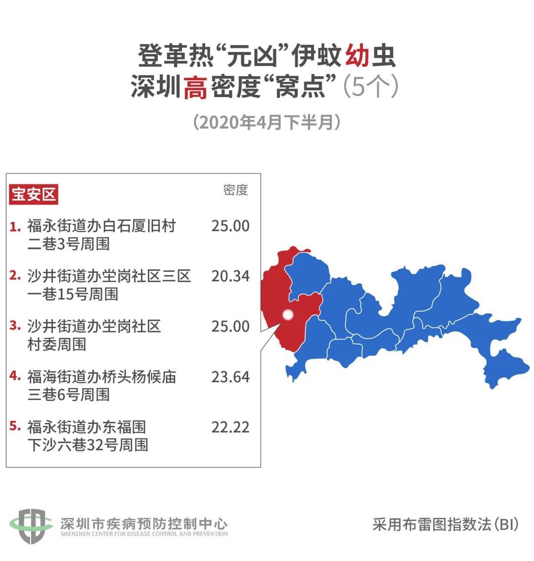 據(jù)悉,在全市設(shè)置的423個監(jiān)測點(diǎn)中,不合格的有104個,占24.59%。其中低密度有79個,中密度有20個,高密度有5個。5個“蚊子窩”全在寶安!