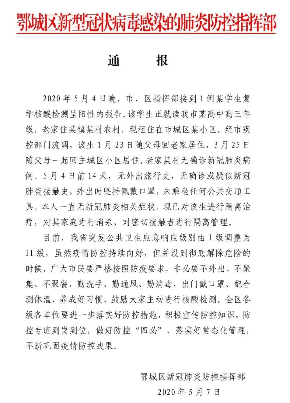 通報稱,5月4日晚,市、區(qū)指揮部接到1例某學生復學核酸檢測呈陽性的報告。該學生正就讀鄂州市某高中高三年級,老家住某鎮(zhèn)某村農(nóng)村,現(xiàn)租住在市城區(qū)某小區(qū)。
