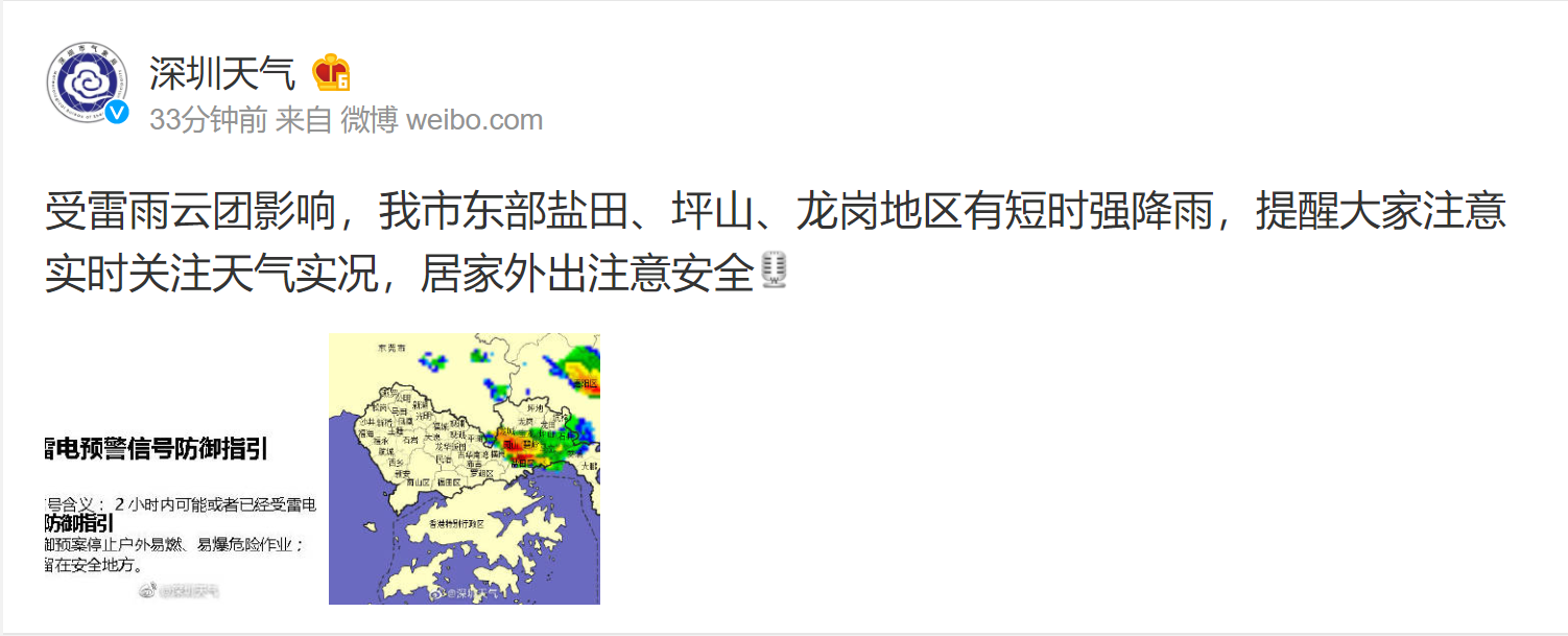 目前,受雷雨云團影響,深圳東部鹽田、坪山、龍崗地區(qū)有短時強降雨。