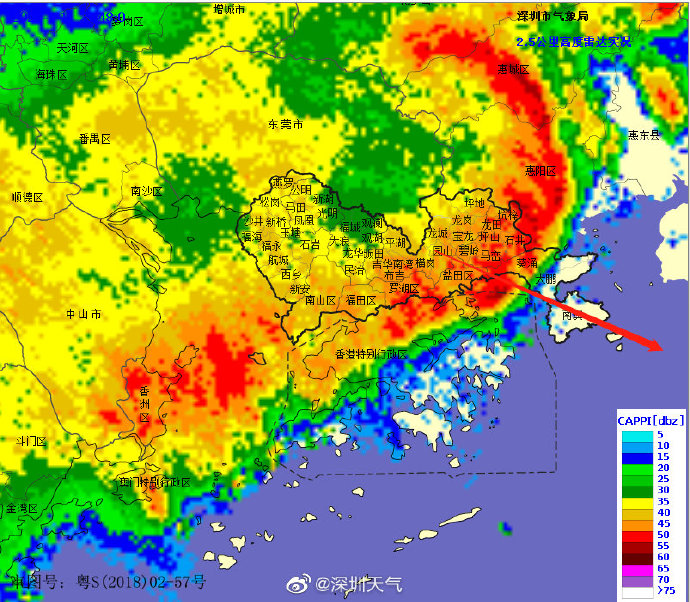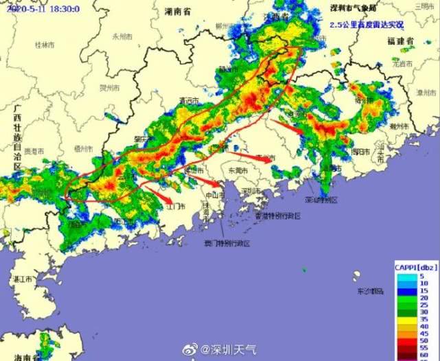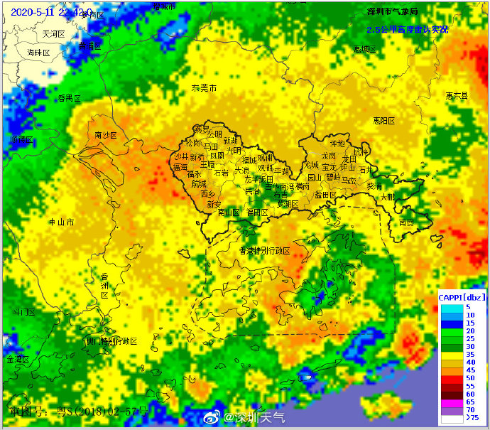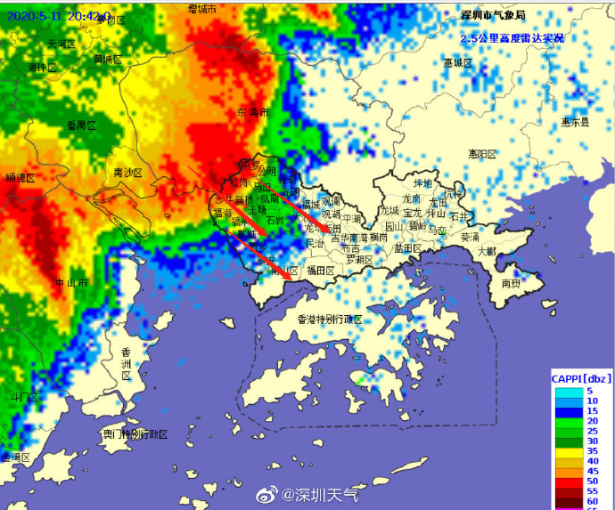 21時49分:目前強雷雨云團已給寶安、光明、龍華、南山、福田等區(qū)域帶來強雷雨和大風,預計即將影響羅湖、鹽田、龍崗、坪山和大鵬,將帶來小時雨量30毫米左右的降雨以及8-9級的短時大風,請注意防御。