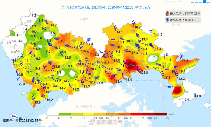 22時18分:過去1小時深圳市最大陣風達到10-11級,出現在鹽田和大鵬南澳地區(qū)。