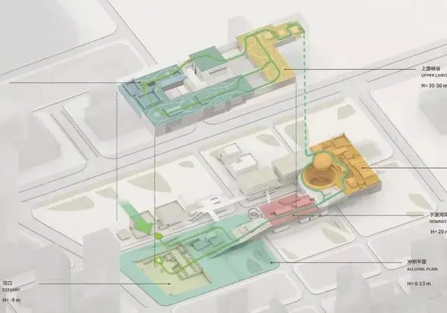 產(chǎn)業(yè)生態(tài)雨林的三個(gè)層級都可經(jīng)由一個(gè)城市公園的多層級通道系統(tǒng)抵達(dá),仿佛曲折蜿蜒的河水流過緩坡。