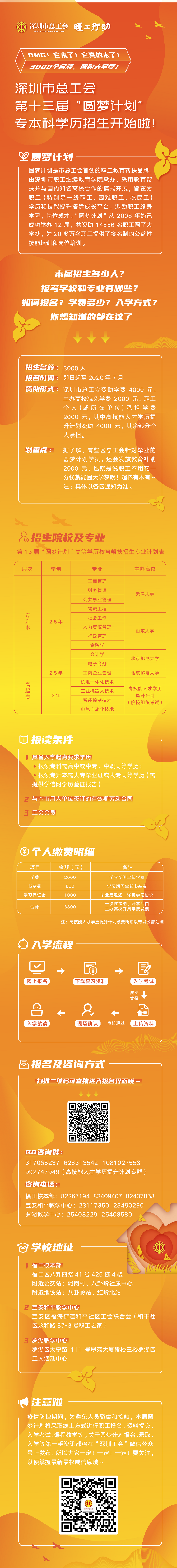 在疫情防控、復(fù)工復(fù)產(chǎn)的特殊形勢下,結(jié)合市總工會“暖工行動”相關(guān)要求,本屆“圓夢計劃”進(jìn)一步提高幫扶精準(zhǔn)性,向受疫情影響嚴(yán)重的企業(yè)和職工傾斜,推動企業(yè)和職工共擔(dān)責(zé)任、共克時艱,穩(wěn)定職工隊伍和就業(yè),努力做到職工多轉(zhuǎn)崗、少下崗、多就業(yè)、少失業(yè)。符合報名條件的職工可在“深圳工會”微信公眾號上進(jìn)行報名,報名截止日期為7月30日,主辦方將根據(jù)報名人數(shù)分期分批組織入學(xué)考試。入學(xué)考試采用“文化素養(yǎng)+職業(yè)技能+工作實績”的多元評價方式,在“文化素養(yǎng)”為主體考試中增加工會基本知識,提高職工工會意識。所有錄取學(xué)員將于今年9月入學(xué)就讀,進(jìn)行線上線下相結(jié)合的學(xué)習(xí),在規(guī)定學(xué)制內(nèi)修滿學(xué)分將獲得各高校頒發(fā)、國家承認(rèn)的畢業(yè)證書。