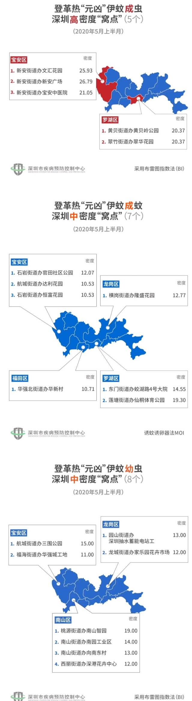 5月18日,深圳市疾控中心發(fā)布了5月上半月(5月1日-15日)的全市伊蚊密度監(jiān)測結果,高、中密度的20個“窩點”里,有8個是居民小區(qū),其余多為公園、工地,還有1個是醫(yī)院。