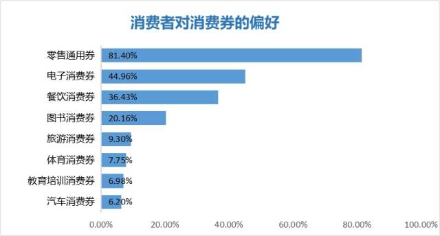 調(diào)研發(fā)現(xiàn),消費(fèi)券對(duì)于促進(jìn)消費(fèi)有較大作用。42%的消費(fèi)者希望拿到消費(fèi)券,47%的消費(fèi)者持中立態(tài)度,但表示如果得到了消費(fèi)券的話更愿意主動(dòng)去消費(fèi)。在各種類型的消費(fèi)券中,消費(fèi)者喜歡的前三種類型分別是零售通用券、電子消費(fèi)券和餐飲消費(fèi)券,消費(fèi)者選擇的占比分別為81.40%、44.96%和36.43%。