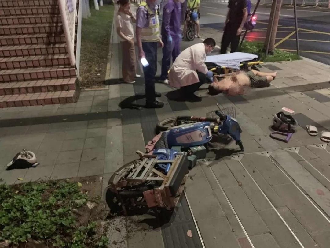 該男子上半身裸露橫躺在人行道上,而且臉上、身上多處擦傷,右眼淤青紅腫,旁邊還有一輛損壞的兩輪電動車,坐墊、鎖鏈、頭盔散落一地。