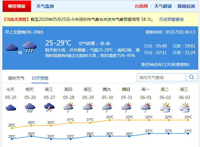 見圳客戶端·深圳新聞網2020年5月25日訊 連續(xù)陰雨雷暴,上周末的天氣趨于平靜,但是,新一波“龍舟水”馬上到貨!據深圳氣象臺消息,25-26日深圳有大雨到暴雨,并伴有雷暴和8級左右短時大風,降雨主要出現在25日中午至26日上午,26日午后降雨減弱;27-30日仍有陣雨或雷陣雨。