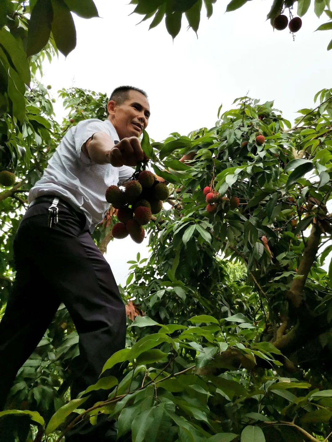 5月28日,西麗果場的種養(yǎng)專家邱金淡一早來到園區(qū),開展病蟲防治,清理荔枝樹上破裂的荔枝。前幾日,一場猛烈的龍舟雨,讓長勢正旺的糯米糍遭受當(dāng)頭一擊,不少爆漿裂果。邱金淡在南山種植荔枝20多年,對各種“天災(zāi)意外”波瀾不驚,談起今年的收成,他苦笑著說,“種植就是看老天爺吃飯”。受雨水影響,糯米糍、桂味減產(chǎn)明顯。早熟品種妃子笑受影響較小,已由青轉(zhuǎn)紅成熟,開始陸續(xù)上市。