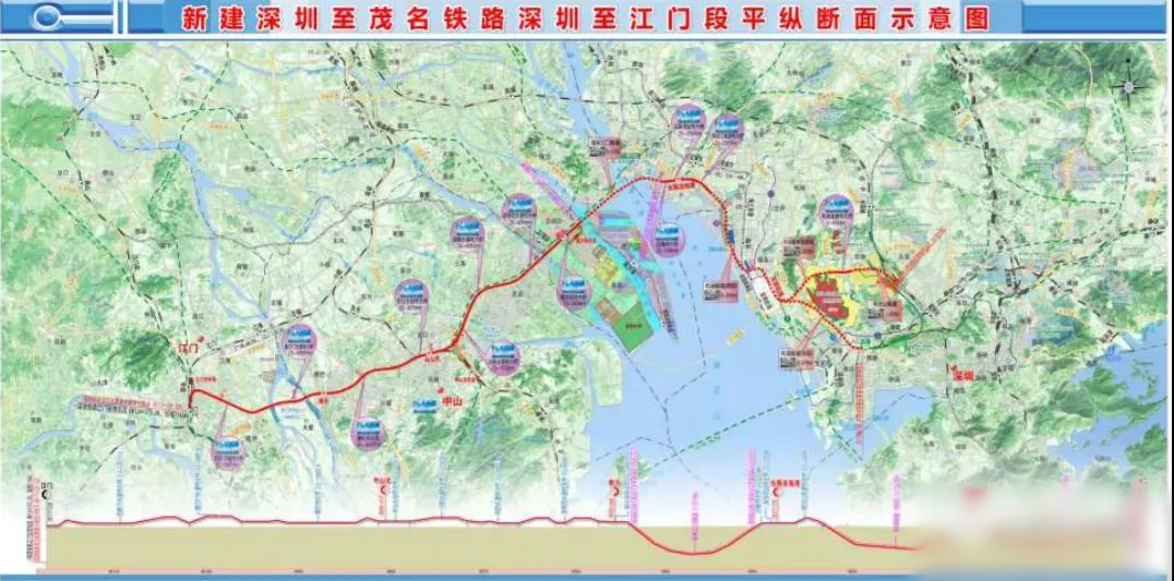 新建鐵路深圳至茂名鐵路深圳至江門(mén)段正線從深圳樞紐西麗站(規(guī)劃)引出,經(jīng)深圳市、東莞、南沙區(qū),中山、江門(mén),引入深茂鐵路江門(mén)至茂名段江門(mén)站(在建)。