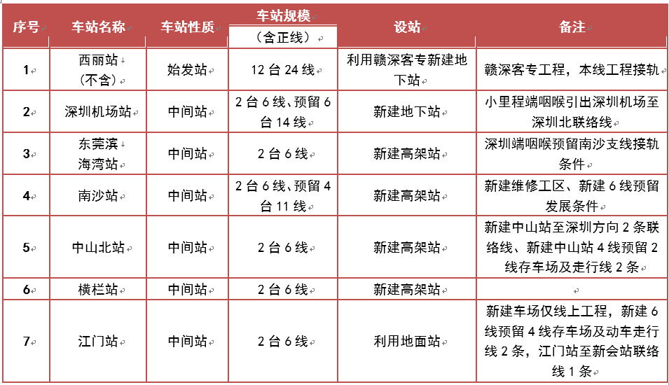 項(xiàng)目共設(shè)西麗(不含)、深圳機(jī)場(chǎng)、濱海灣、南沙、中山北、橫欄、江門(mén)等7個(gè)車站,其中西麗、深圳機(jī)場(chǎng)為地下站,濱海灣、南沙、中山北、橫欄為高架站,江門(mén)站為地面站。