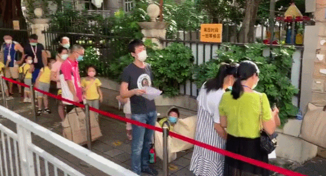 已有家長(zhǎng)帶著孩子等待入園