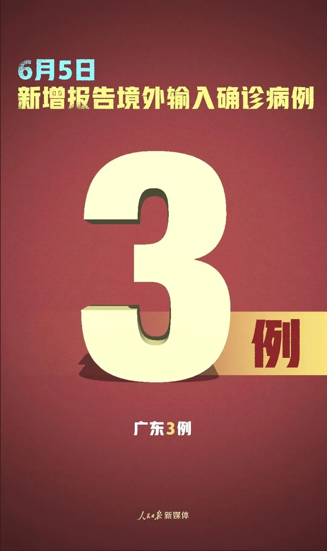 6月5日0-24時(shí),31個(gè)省(自治區(qū)、直轄市)和新疆生產(chǎn)建設(shè)兵團(tuán)報(bào)告新增確診病例3例,均為境外輸入病例(廣東3例);無(wú)新增死亡病例;新增疑似病例1例,為境外輸入病例(上海1例)。