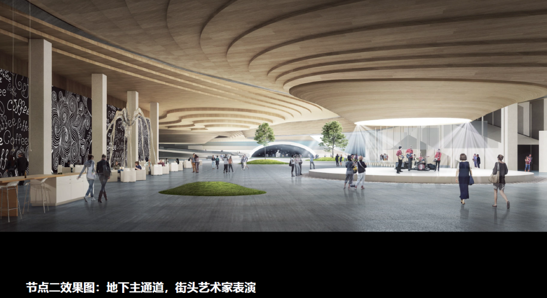 穿過洞穴般的地鐵出口,景象瞬間開闊,陽光透過構(gòu)筑物和煦的灑下,伴著兩側(cè)綠植和藝術墻緩緩升到負一層,達到商業(yè)線性軸和藝術通道的交匯處。