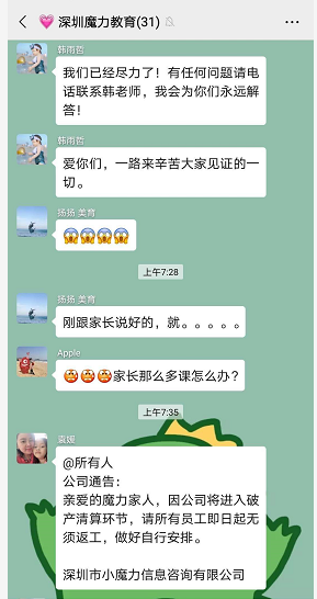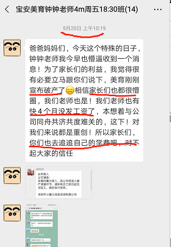 一名丁姓家長(zhǎng)介紹,5月20日,家長(zhǎng)接到美育老師消息,稱公司剛剛宣布破產(chǎn),老師工資被拖欠4個(gè)月。家長(zhǎng)介紹,老師曝光該消息后,培訓(xùn)機(jī)構(gòu)支付了他們的拖欠工資。隨后大量老師離職。