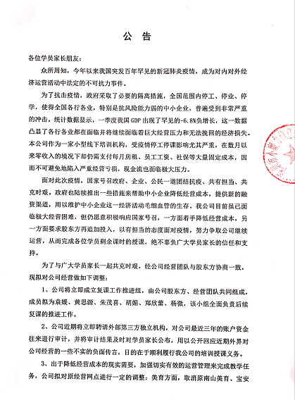 公告稱,公司成立由股東和老師組成的復(fù)課工作推進(jìn)組,申請(qǐng)?jiān)缛諒?fù)課,時(shí)間初定于6月中旬;并將聘請(qǐng)外部第三方獨(dú)立機(jī)構(gòu)審計(jì)賬戶資金,澄清不實(shí)經(jīng)營(yíng)傳言;還將取消寶安、南山兩個(gè)經(jīng)營(yíng)網(wǎng)點(diǎn),所有美育學(xué)生安排去福田上課。
