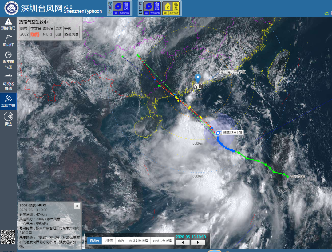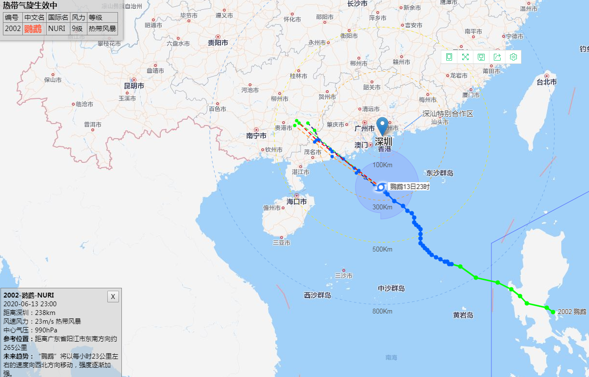 06月14日12時(shí),2002號臺(tái)風(fēng)“鸚鵡”(熱帶風(fēng)暴級)的中心位于陽江市陽西縣,中心附近最大風(fēng)力8級,向西北方向移動(dòng),強(qiáng)度逐漸減弱,下午將進(jìn)入廣西。截止目前深圳(含深汕)出現(xiàn)中雨局部大雨和6-9級陣風(fēng)。今天午后有間歇性(雷)陣雨,降雨時(shí)伴有6-7級陣風(fēng)。