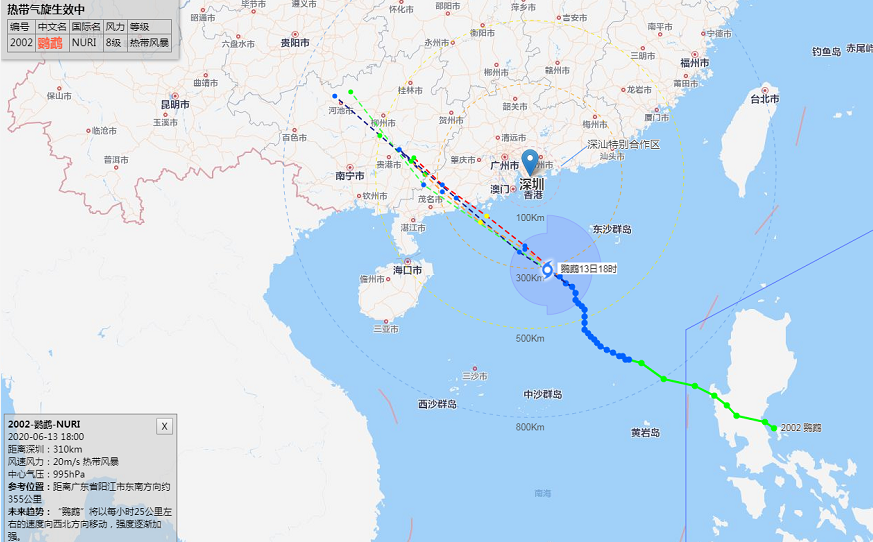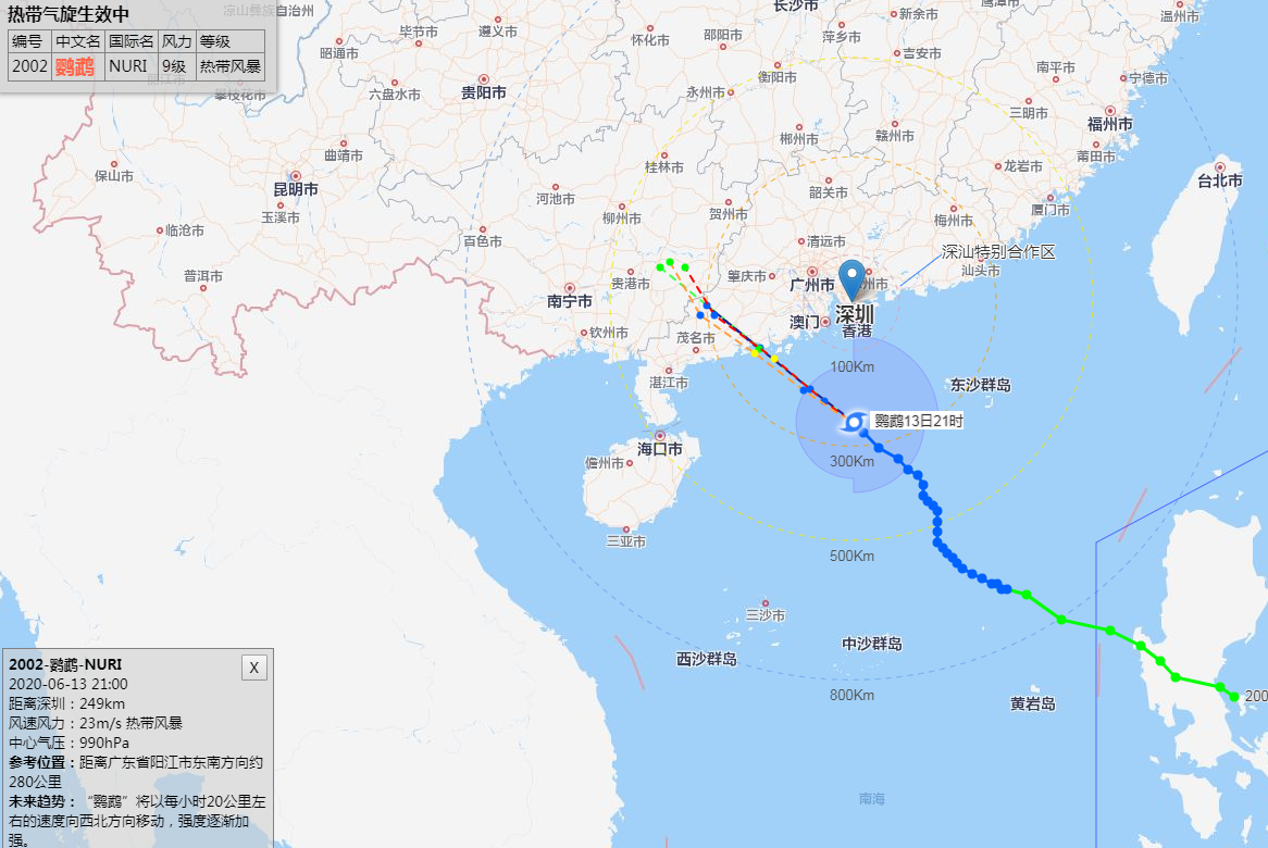 深圳市氣象臺(tái)2020年06月13日15時(shí)30分發(fā)布:6月13日15時(shí)臺(tái)風(fēng)“鸚鵡”(熱帶風(fēng)暴級)位于深圳市偏南方約387公里南海海面上,中心附近最大風(fēng)力8級。預(yù)計(jì)其將繼續(xù)向西北方向移動(dòng),14日白天趨向江門至茂名海域,最大可能以強(qiáng)熱帶風(fēng)暴級在陽江附近登陸。我市13日17時(shí)后起風(fēng)力逐漸加大,13日夜間至14日上午為風(fēng)雨主要影響時(shí)段,有大雨到暴雨,沿海和海區(qū)最大陣風(fēng)8-10級。目前臺(tái)風(fēng)藍(lán)色和雷電預(yù)警信號生效中。