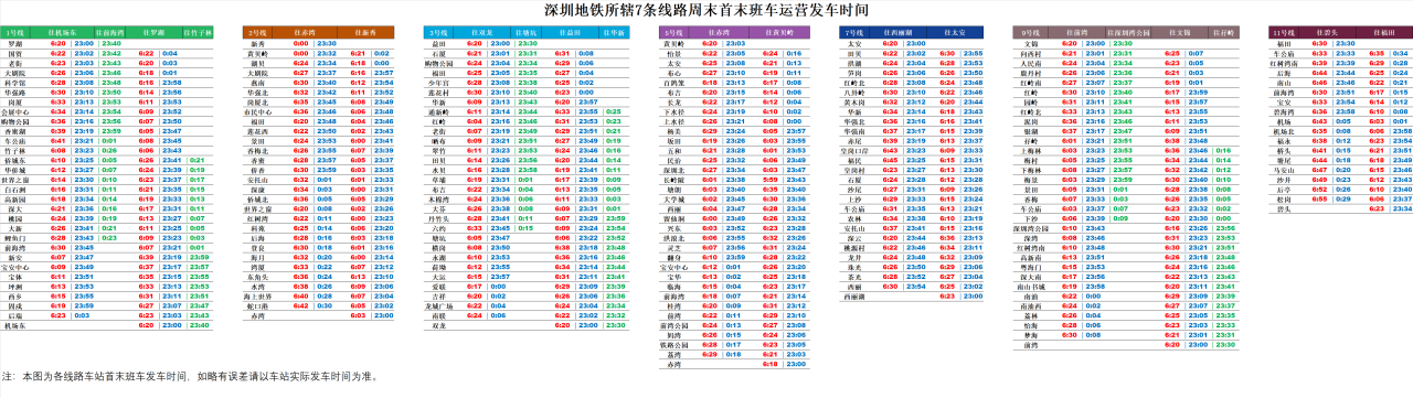 據(jù)介紹,周末期間1號(hào)線(xiàn)羅湖、機(jī)場(chǎng)東首班車(chē)時(shí)間提前至6:20,部分中間站的首班車(chē)最早提前至6:05左右;半程末班車(chē)服務(wù)延長(zhǎng)至23:40分,分別從羅湖往前海灣、機(jī)場(chǎng)東往竹子林方向發(fā)車(chē)。2號(hào)線(xiàn)往新秀方向部分中間站首班車(chē)提前至6:00,往赤灣方向末班車(chē)延長(zhǎng)至23:30。3號(hào)線(xiàn)部分中間站的首班車(chē)提前至6:05左右;半程末班列車(chē)服務(wù)保持原有的23:30,分別從益田往塘坑、雙龍往華新發(fā)車(chē)。9號(hào)線(xiàn)部分中間站的首班車(chē)最早提前至6:05左右;半程末班列車(chē)服務(wù)延長(zhǎng)至23:30,分別從文錦至深圳灣公園、前灣至孖嶺發(fā)車(chē)。