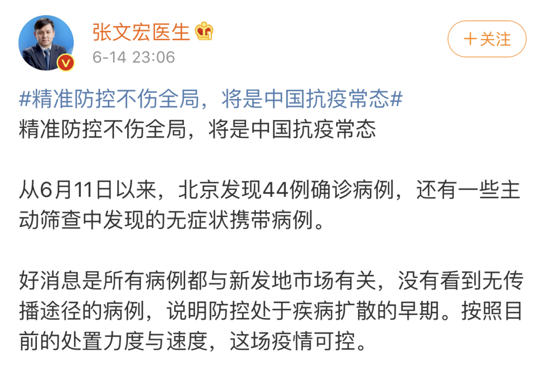 6月14日,張文宏醫(yī)生在微博上發(fā)布了名為《精準(zhǔn)防控不傷全局,將是中國(guó)抗疫常態(tài)》的文章,針對(duì)北京近日新發(fā)的新冠疫情,他是這么說(shuō)的: