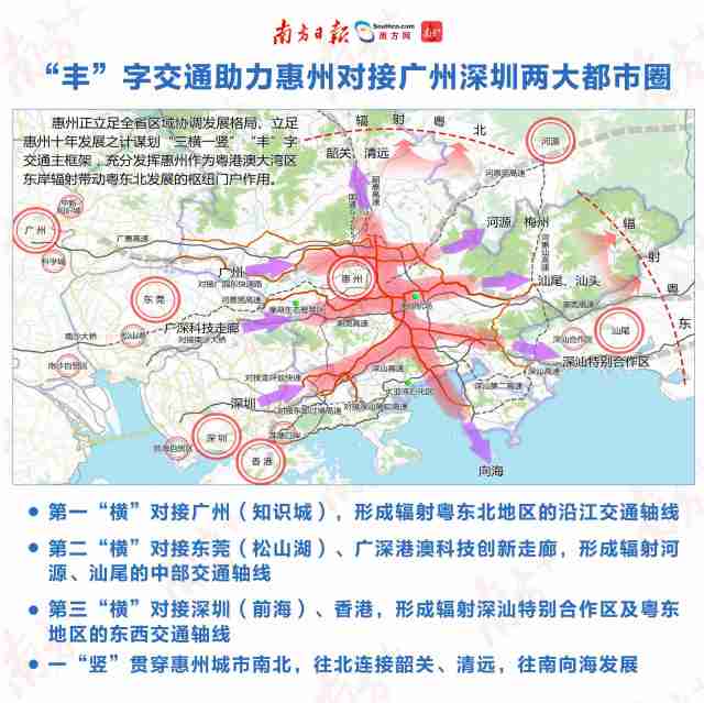 陳鴻宇舉例說,介于廣深兩大都市圈之間的惠州,大手筆規(guī)劃“豐”字交通主框架,向西分別對接廣州、東莞、深圳,向東輻射河源、汕尾等地,向北則連接韶關(guān)、清遠(yuǎn)。類似這樣,各城市可緊密對接,推進(jìn)更多跨城市、跨都市圈的合作。