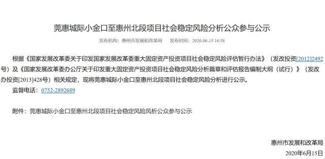 6月15日下午,惠州市發(fā)改局發(fā)布《莞惠城際小金口至惠州北段項(xiàng)目社會穩(wěn)定風(fēng)險分析公眾參與公示》,征求公眾對項(xiàng)目建設(shè)的意見和建議。