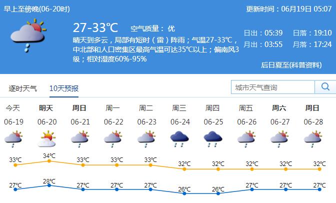 19日晴天間多云,局部有短時(shí)(雷)陣雨;氣溫27-33℃,北部地區(qū)最高氣溫34-35℃。