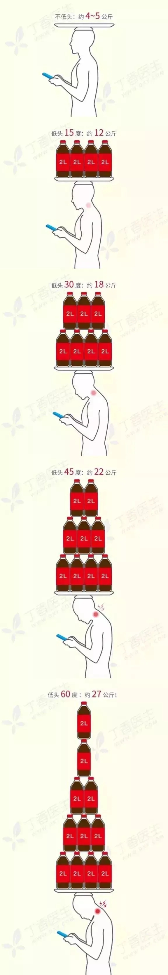 你知道人的頭多重嗎?5公斤左右。所以,當你抬頭挺胸時,脖頸只需要承受約5公斤的重量。但是,在你前傾低頭60度看手機時,頸部就需承受25~30公斤的重量!