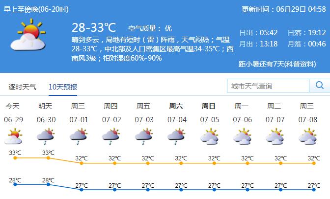 見(jiàn)圳客戶端·深圳新聞網(wǎng)2020年6月29日訊 我市29日晴到多云,局地有短時(shí)(雷)陣雨,天氣悶熱;氣溫28-33℃,中北部及人口密集區(qū)最高氣溫34-35℃;西南風(fēng)3級(jí);相對(duì)濕度60%-90%。