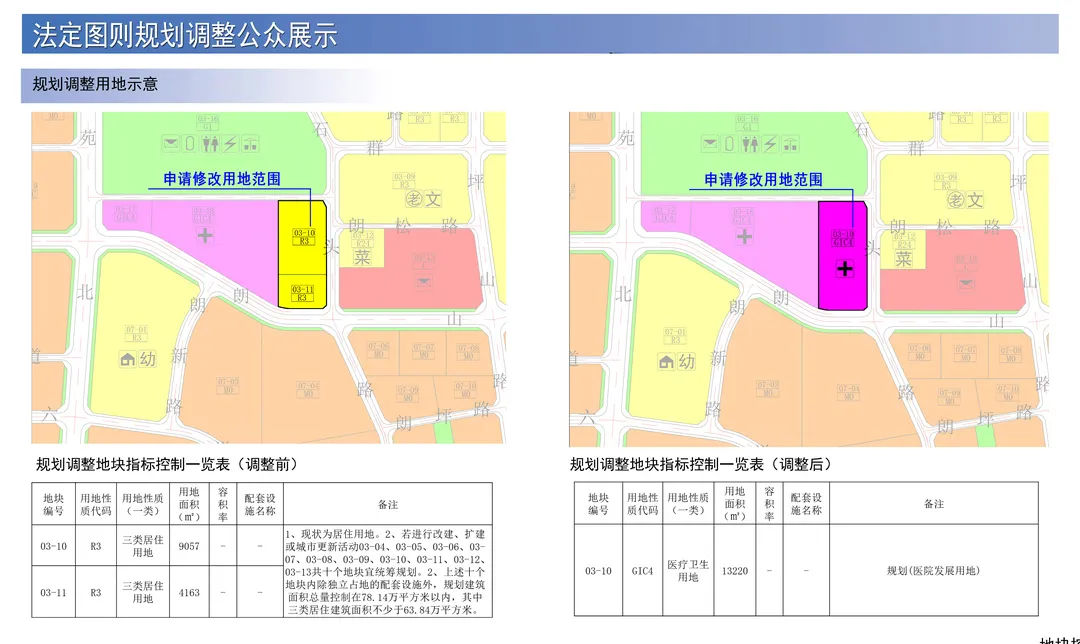 據(jù)悉,在擬調(diào)整前,03-10、03-11地塊規(guī)劃均為居住用地,用地面積分別為9057平方米、4163平方米。兩地塊與已建成的中國(guó)醫(yī)學(xué)科學(xué)院阜外深圳醫(yī)院南山院區(qū)僅一路之隔,位于其東側(cè),現(xiàn)狀為居住用地,建有6棟東西走向的住宅樓。
