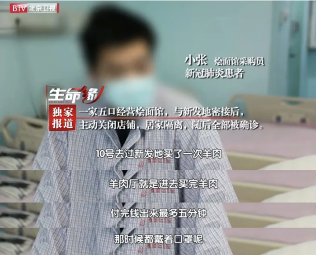 據(jù)小張回憶,6月10日,他在新發(fā)地牛羊肉大廳購(gòu)物不超過(guò)5分鐘,且全程佩戴了口罩但還是“中招”了。