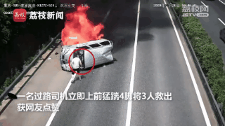 近日,重慶一面包車高速上突然失控,撞向護欄側(cè)翻,隨即起火,車內(nèi)3人被困。一名司機路過,上去4腳踹碎擋風(fēng)玻璃,助3人脫困。