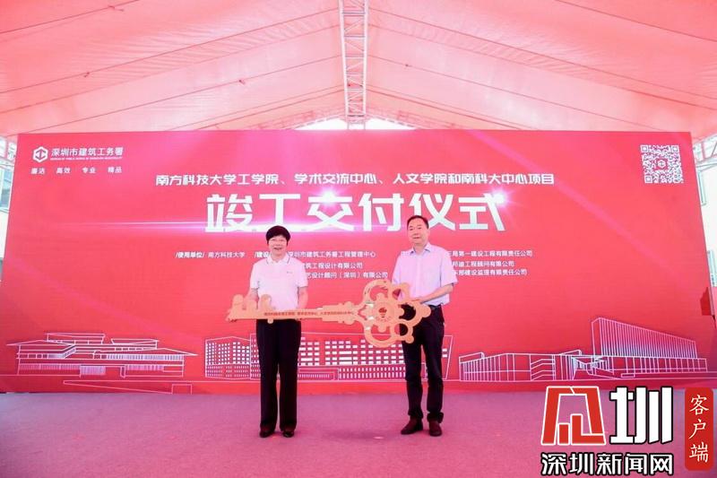 深圳市建筑工務(wù)署署長喬恒利向南方科技大學黨委書記郭雨蓉移交鑰匙牌。