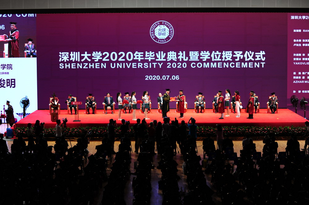 見圳客戶端·深圳新聞網(wǎng)2020年7月6日訊(見圳客戶端、深圳新聞網(wǎng)記者 金洪竹 梁榆其)又是一年鳳凰花開,又是一年畢業(yè)季。7月6日,深圳大學(xué)2020年畢業(yè)典禮暨學(xué)位授予儀式在深圳大學(xué)元平體育館舉行。為了讓畢業(yè)生的青春不留遺憾,今年學(xué)校的畢業(yè)典禮規(guī)格不降,采取“主會(huì)場(chǎng)+分會(huì)場(chǎng)”“線上+線下”的模式舉行。典禮全程通過新華網(wǎng)、央視新聞客戶端、人民視頻、抖音等多家媒體平臺(tái)同步直播,讓身處各地的畢業(yè)生、老師、校友、家長,可以跨越山海、相聚“云端”、同步觀禮。