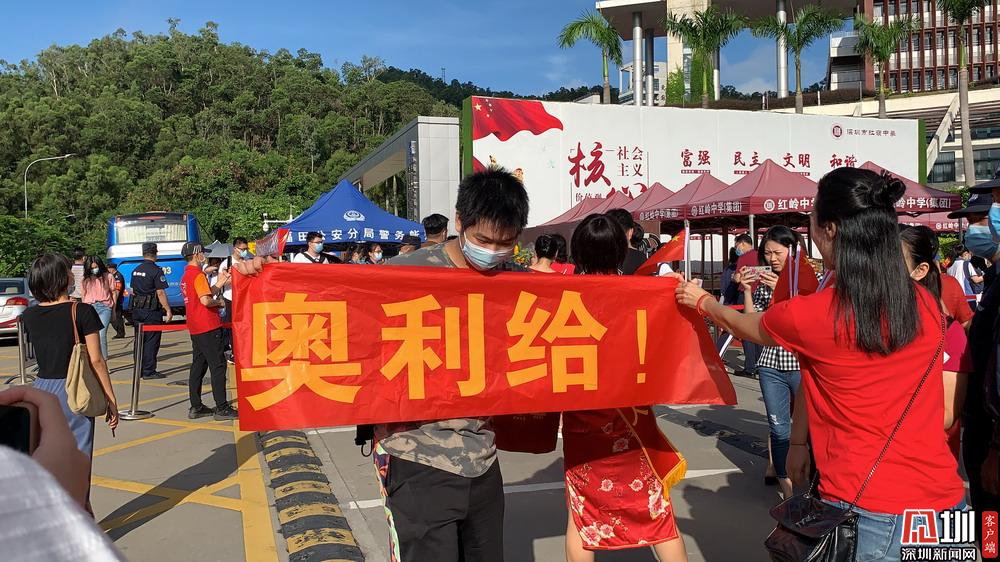 【紅嶺中學(xué)】考生學(xué)長(zhǎng)來(lái)到考點(diǎn)門口為學(xué)弟舉起“奧利給”的旗子。