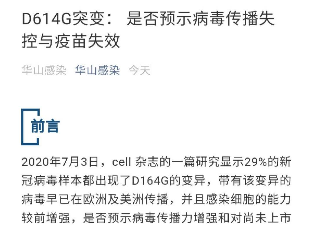 張文宏稱,特別是在7月3日,國際著名雜志《細胞》發(fā)表文章顯示,29%的新冠病毒樣本出現(xiàn)了D164G的變異,此次北京疫情反彈中發(fā)現(xiàn)的病毒株也有這個突變。