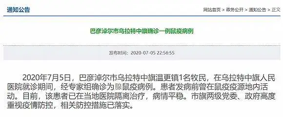 7月5日傍晚,內(nèi)蒙古巴彥淖爾市衛(wèi)生健康委員會發(fā)布通告稱,烏拉特中旗人民醫(yī)院報告了1例疑似腺鼠疫病例,經(jīng)研究決定,于7月5日發(fā)布鼠疫防控Ⅲ級預警。當天晚間,巴彥淖爾市衛(wèi)生健康委員會再次發(fā)布通告稱,該市烏拉特中旗確診一例鼠疫病例。