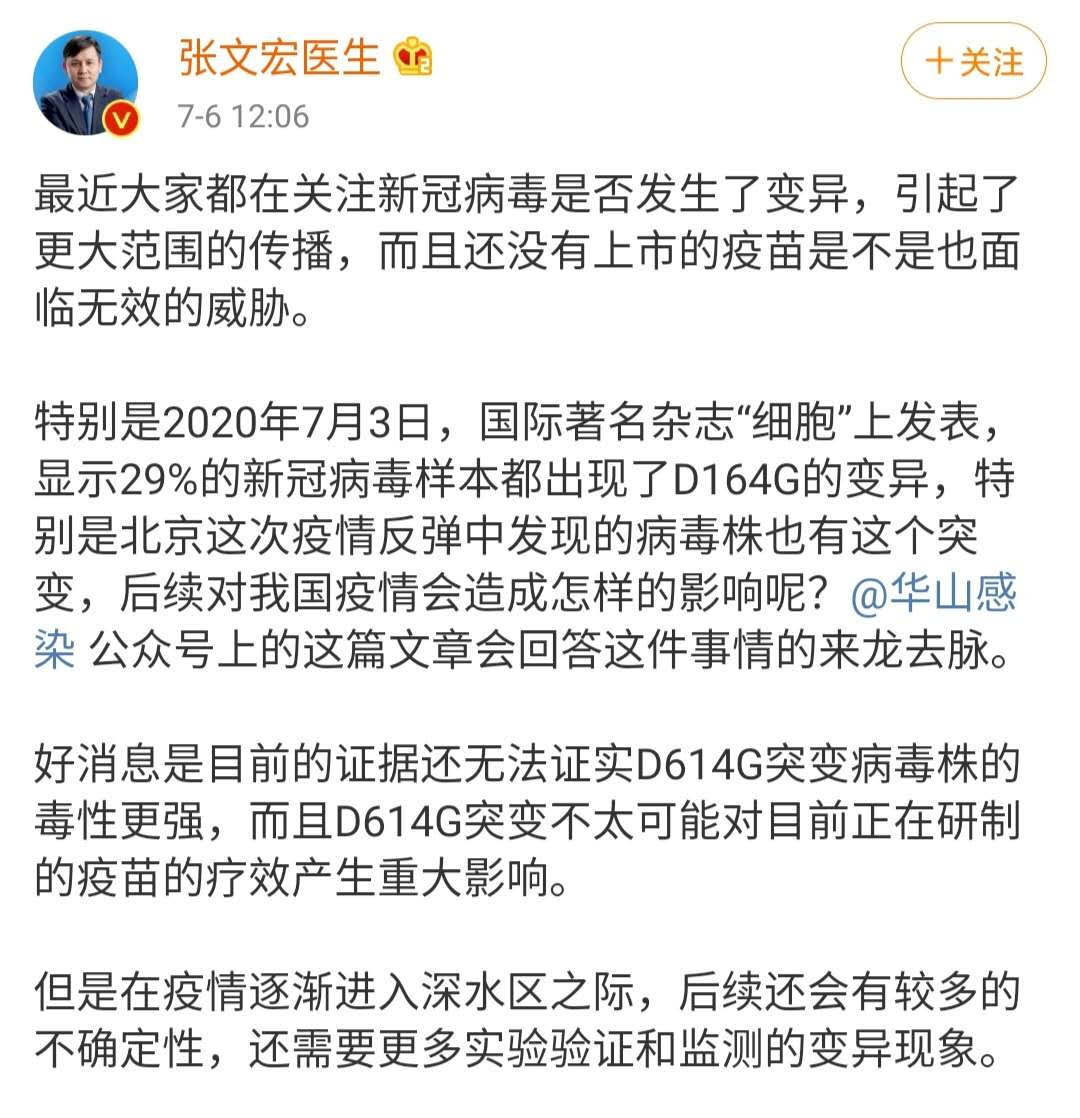 7月6日,上海復旦大學附屬華山醫(yī)院感染科主任張文宏通過微博談“29%新冠病毒樣本現(xiàn)D614G變異”一事。