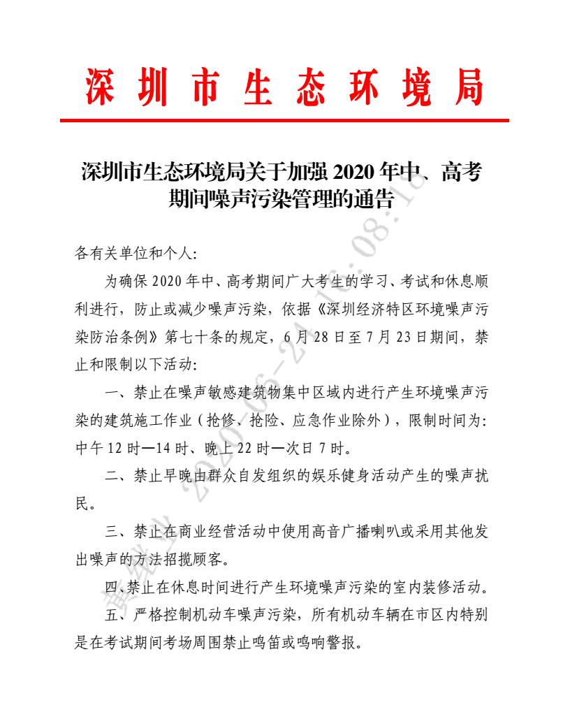 根據(jù)《深圳經(jīng)濟(jì)特區(qū)環(huán)境噪聲污染防治條例》的規(guī)定,高考考點(diǎn)方圓500米范圍內(nèi)工地要求24小時禁止施工作業(yè),黃木崗綜合交通樞紐一工區(qū)剛好在此范圍內(nèi),因此高考兩天全面禁止施工。