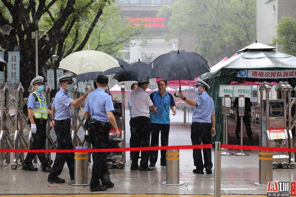 上午11時,深圳部分地區(qū)下起陣雨,交警在考點(diǎn)外了解現(xiàn)場情況。