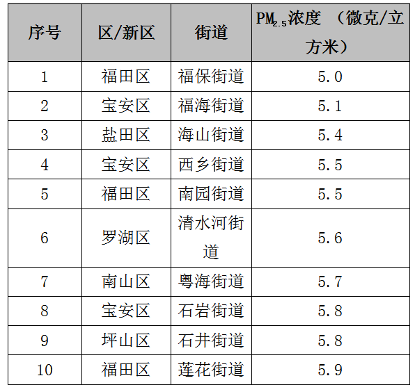 見(jiàn)圳客戶(hù)端·深圳新聞網(wǎng)2020年7月8日訊(深圳特區(qū)報(bào)記者 竇延文)7月8日,深圳市生態(tài)環(huán)境局發(fā)布今年6月74街道PM2.5濃度排名情況。福田區(qū)福保街道空氣質(zhì)量最優(yōu),PM2.5濃度僅為5.0微克/立方米。