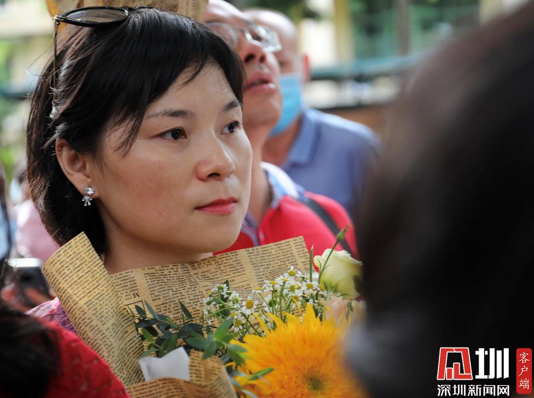 深圳高級(jí)中學(xué)考點(diǎn)外家長受捧鮮花、滿懷期待。