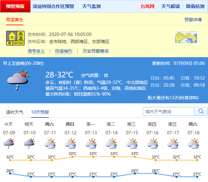 深圳今日多云有雨 高溫黃色預(yù)警信號生效中