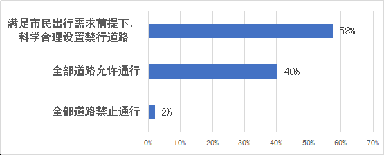 據調查,約58%的市民支持在滿足市民出行需求前提下,科學合理設置禁行道路;40%的市民認為應該全部道路允許電動二輪車通行;僅2%的市民認為電動二輪車應當在全部道路禁止通行。