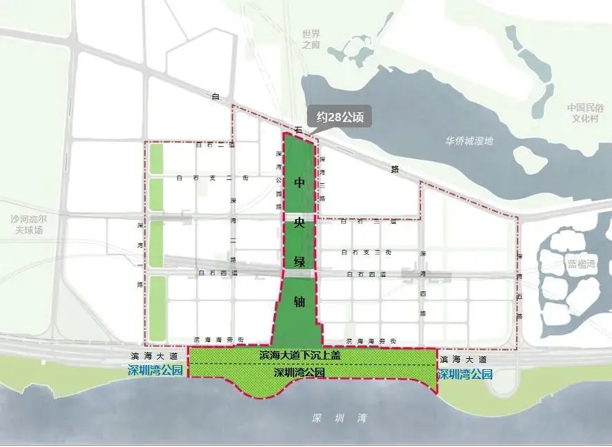 ▲深圳灣超級(jí)總部基地中央綠軸設(shè)計(jì)范圍示意圖