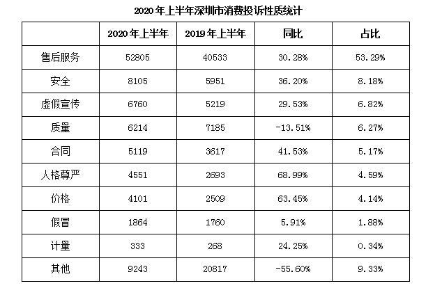 根據(jù)《情況分析》,2020年上半年,深圳市消委會收到的消費投訴問題性質最多的為售后服務,共52805宗,占比53.29%;其次為安全問題,共8105宗,占比8.18%;第三是虛假宣傳問題,共6760宗,占比6.82%。有關人格尊嚴問題、價格問題的投訴量與2019年相比均同比上漲超過60%;有關質量問題的投訴量與2019年相比均有所下降。