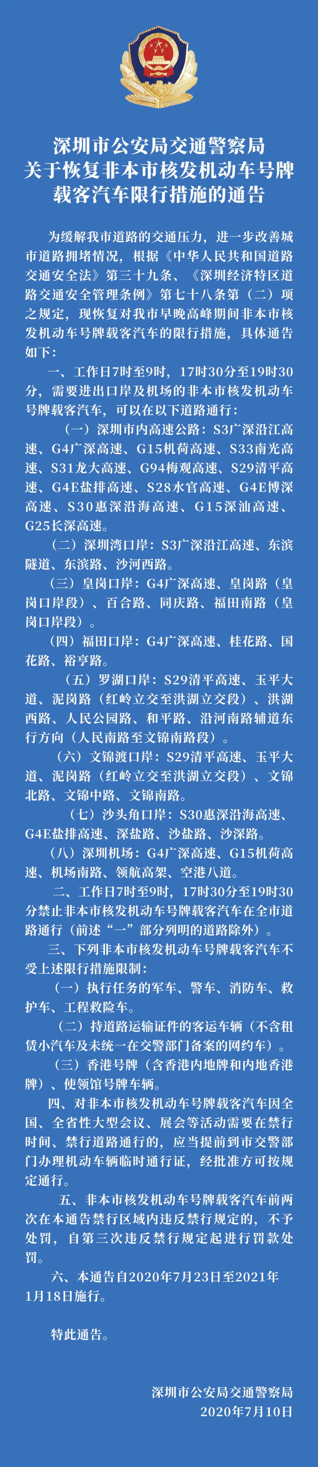見圳客戶端?深圳新聞網(wǎng)2020年7月15日訊(見圳客戶端、深圳新聞網(wǎng)記者 張喆 陳彥如 實(shí)習(xí)生 廖章霖)7月15日,記者從深圳市交警支隊(duì)了解到,7月23日開始深圳將恢復(fù)“限外令”,對(duì)非深號(hào)牌小型載客汽車恢復(fù)限行。本次“限外令”與此前保持一致,除全市高速公路和部分疏港通道不限行以外,全市所有道路在早7:00-9:00和晚17:30-19:30高峰時(shí)段對(duì)所有非深圳號(hào)牌載客汽車實(shí)施限行。