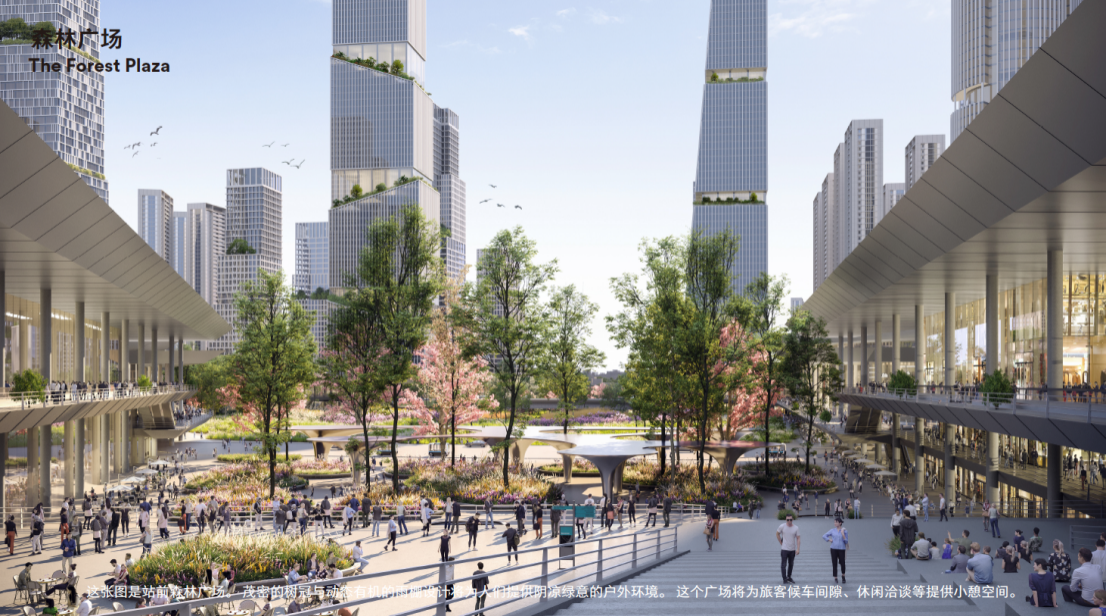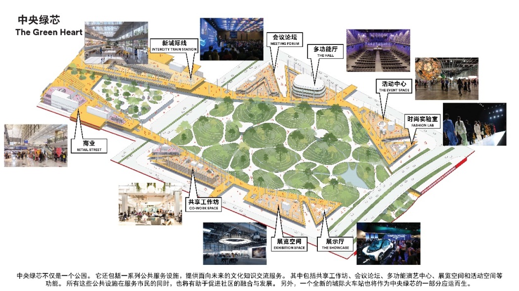 方案以獨(dú)特的“綠鏈都芯”為理念,打造一個(gè)耦合生態(tài)、交通和公共生活的超級(jí)樞紐。設(shè)計(jì)的中央綠芯引入大面積森林和草甸,使人們?cè)诔鞘兄兄赜鲎匀?,讓北站樞紐地區(qū)既擁有大城市商務(wù)中心區(qū)的特質(zhì),也擁有郊外自然的品質(zhì),形成全新的都市生活體驗(yàn)。同時(shí),中央綠芯還包括會(huì)議論壇、多功能演藝中心等一系列公共服務(wù)設(shè)施,提供面向未來(lái)的文化知識(shí)交流服務(wù)。