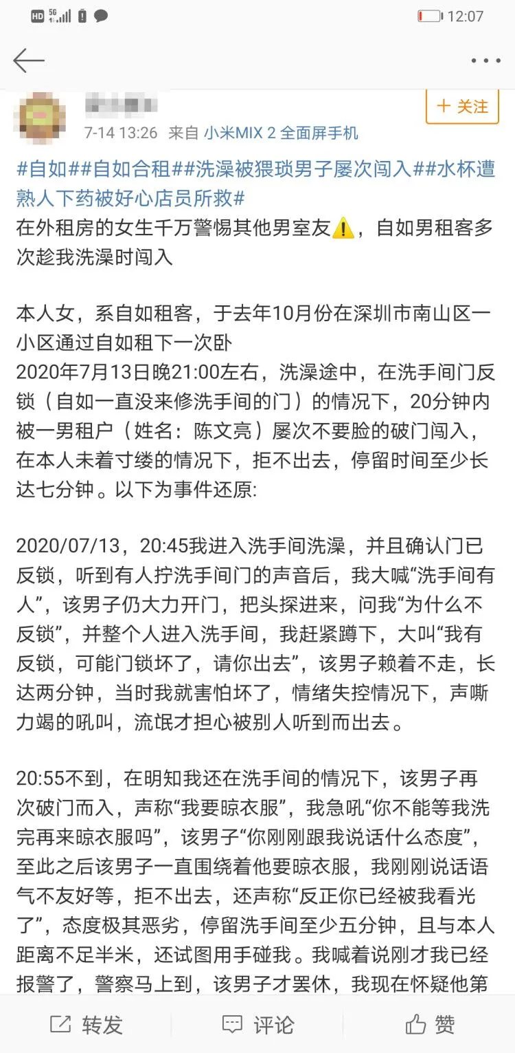 7月14日,梁女士在新浪微博發(fā)帖稱,她是南山某小區(qū)的自如租客,其在7月13日21時(shí)許的洗澡過(guò)程中,遭遇男性室友屢次闖入。根據(jù)梁女士描述,該男子態(tài)度惡劣,在梁女士未著寸縷的情況下在浴室停留時(shí)間長(zhǎng)達(dá)數(shù)分鐘,其間還試圖伸手觸碰梁女士。梁女士回到房間后,向自如管家進(jìn)行反饋并報(bào)警。